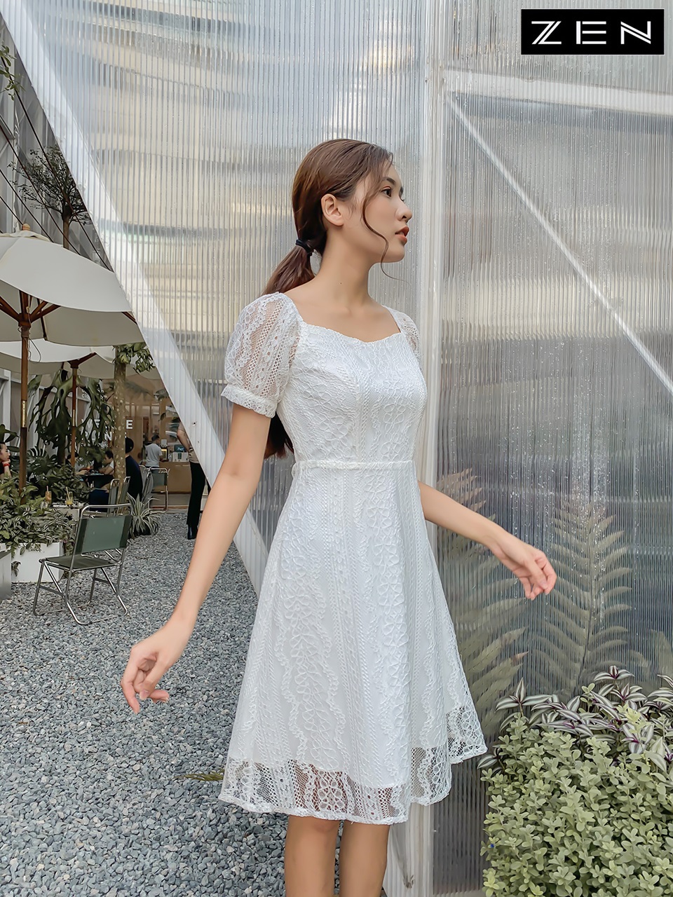 20/V082/02 VÁY XÒE, CỘC TAY, PHỐI REN TRẮNG