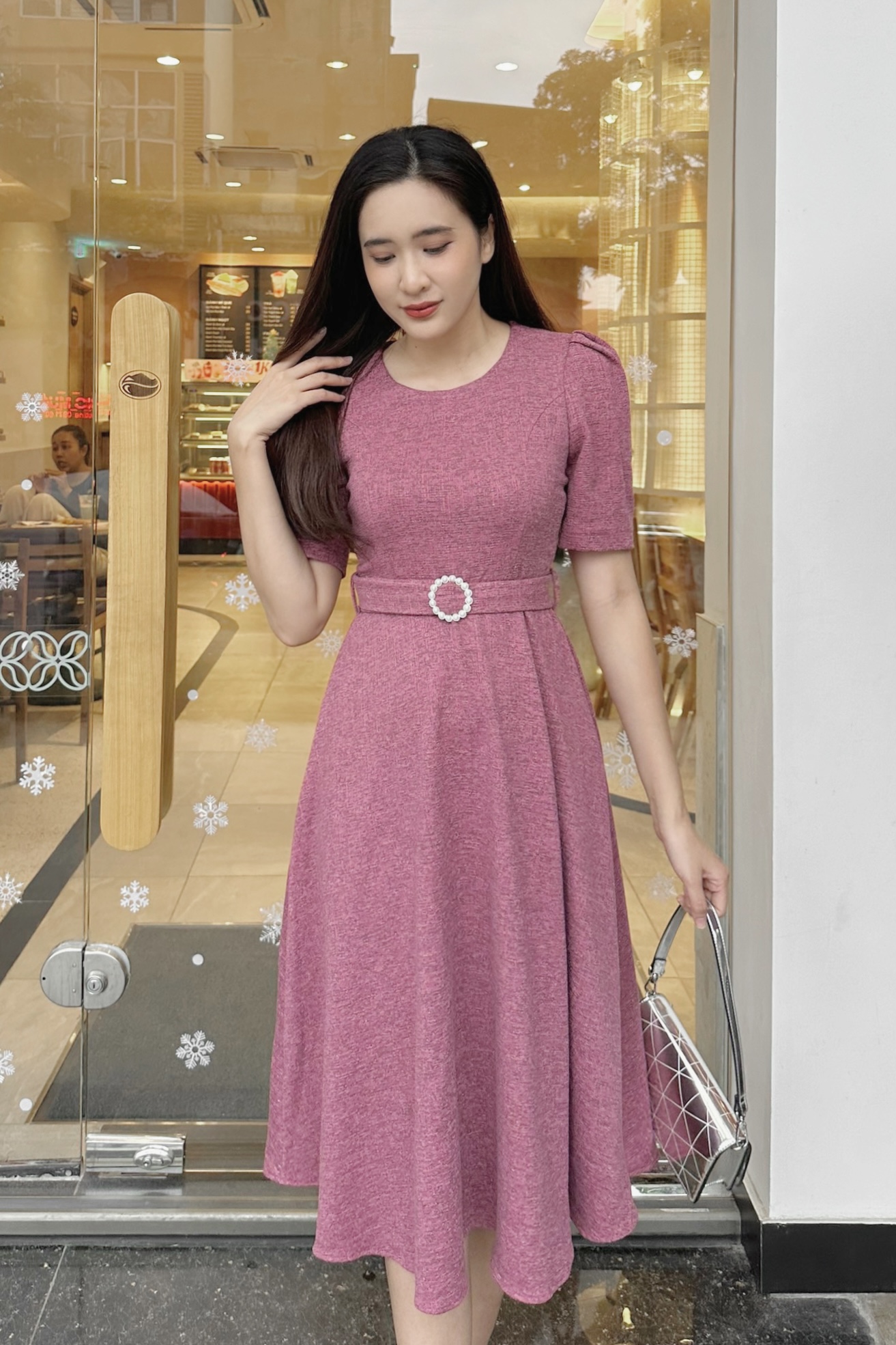 23/V058/XL/03/VÁY XÒE, TL, ĐAI EO, HỒNG